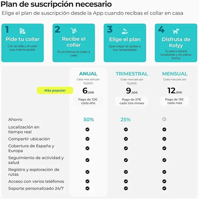 Datos importantes: Kolyy es el único collar GPS para perros que registra pasos y actividad, proporcionando métricas esenciales para el bienestar físico de tu perro. Conecta el collar a nuestra app y descubre nuevas funciones como el medidor de salud para mantener a tu mascota en óptimas condiciones. Cuenta tus pasos, controla su salud cardíaca y personaliza tus objetivos.